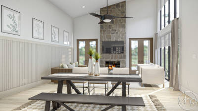 The Rock Creek Barndomium is a versatile and stylish dwelling that combines the rustic charm of a barn with the comforts of a contemporary home. The exterior features a traditional board and batten facade, with clean lines and large windows, providing an abundance of natural light and a connection to the surrounding landscape. The covered patio and pergola add an inviting outdoor space, seamlessly blending the indoor and outdoor living areas.